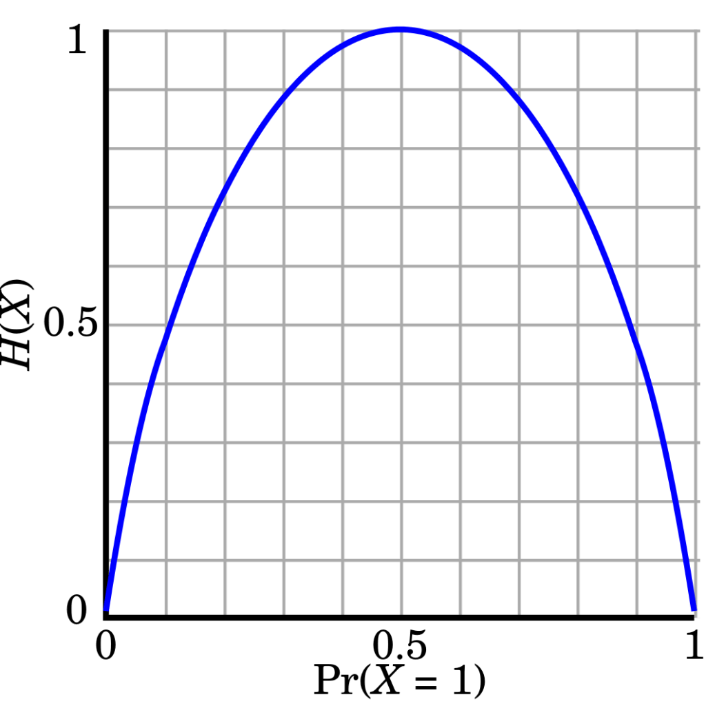 Uma regra simples na teoria da informação é que um bit de informação é equivalente a cortar as possibilidades pela metade, porque metade das possibilidades seria equivalente a um evento com probabilidade e este contém