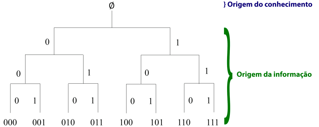 Dessa forma, como é possível ver pela figura, ele terá que pedir informação nos pontos “A”, “B” e “C”. Note que independente do destino {000, 001, 011, . . .} o número de perguntas para alcançá-lo (neste caso) é sempre três. Ou seja, escolher entre oito destinos requer três perguntas: