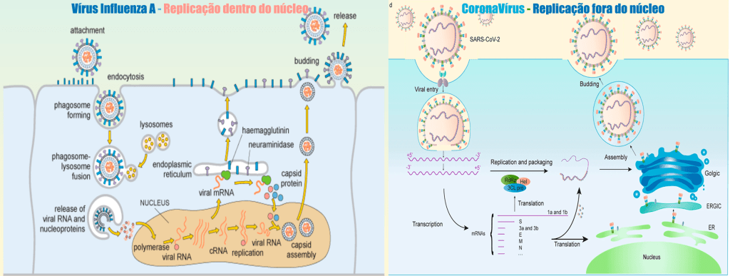 A principal diferença reside na dinâmica de replicação/transcrição, o vírus Influenza A, após sua entrada na célula precisa injetar o material genético mRNA dentro do núcleo celular (para fazer a replicação e transcrição). O coronavírus não precisa fazer isso, após sua entrada na célula ele faz a replicação e transcrição no citoplasma fora do núcleo e domina a célula de modo a transformar as organelas ribossomos em fábricas de componentes para montagem de novas naves infecciosas (vírions ativos). Observe a imagem acima.