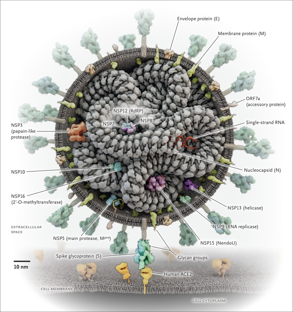 A principal razão para o coronavírus SAR-COV-2 ser tão rápido em propagar a pandemia é que ele não precisa chegar ao núcleo celular, bastando apenas invadir uma de nossas células respiratórias – ganha tempo e cada vez mais recursos.