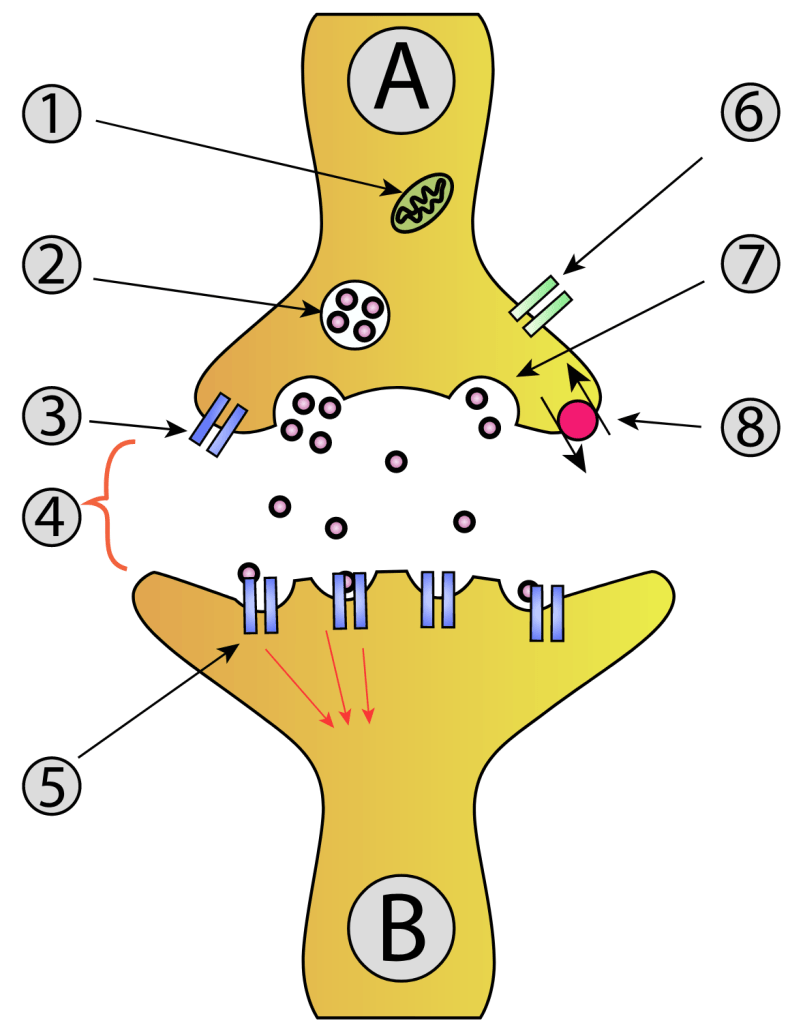 As sinapses químicas consistem na maioria das sinapses presentes no sistema nervoso. Ela consiste numa fenda presente entre o axônio do neurônio que está transmitindo a informação (neurônio pré-sináptico) e o neurônio que receberá uma descarga de neurotransmissores, o receptor (neurônio pós-sináptico).