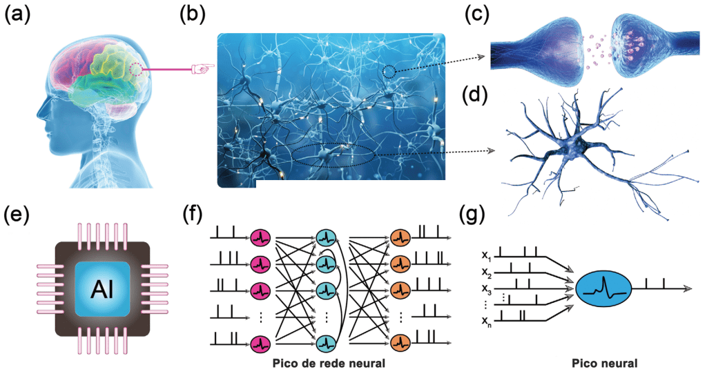 a) O cérebro humano. b) A rede neural biológica. c) Uma sinápse biológica. d) Um neurônio biológico. e) Um chip de IA. f) Disparo de redes neurais. g) Um neurônio de disparo artificial. Créditos: {Yang, Jia-Qin & Wang, Ruopeng & Ren, Yi & Mao, Jingyu & Wang, Zhanpeng & Zhou, Ye & Han, Su-Ting. (2020). Neuromorphic Engineering: From Biological to Spike‐Based Hardware Nervous Systems. Advanced Materials. 32. 2003610.10.1002/adma.202003610.}. Clique na imagem para acesso ao paper explicativo!