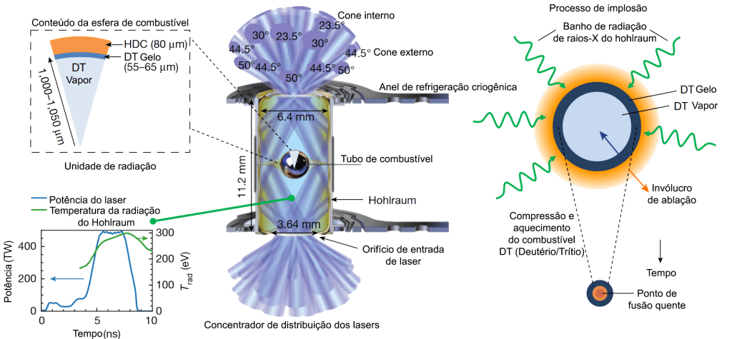 O hohlraum absorve aproximadamente 10-15% dos raios X, causando a ionização da borda externa da cápsula (ablator), gerando alta pressão da ordem de 9.869×108 atm (atmosferas) ou 986,9 milhões de atmosferas terrestres de pressão, um processo denominado ablação. Uma concha criogênica contendo o combustível DT é colocada em camadas dentro da superfície interna do ablator, que está em equilíbrio de pressão parcial com vapor DT no centro da cápsula. A aceleração dirigida para dentro causada pela ablação impulsiona a cápsula e o combustível DT para dentro de si (uma implosão, mostrado esquematicamente à direita na foto acima) com enorme aceleração (cerca de 1014 m s-2) obtendo velocidades de aproximadamente 350-400 km s-1, em questão de nanossegundos, a maior parte da energia de raios X (cerca de 92-95%) é absorvida pela cápsula e consumida pelo processo de ablação, mas com um resultado, o combustível DT obtém energia cinética considerável (cerca de 10-20 kJ) dentro um volume muito pequeno. Ao disparar um conjunto de 192 lasers com uma energia de 2,05 (MJ) mega joules, ocorreu a fusão do Hidrogênio, produzindo o equivalente a 3,15 MJ de energia. O ganho líquido descontado a energia gasta pelo laser foi de 1.9 MJ (Mega Joules) ou 528 Wh (Watts hora).