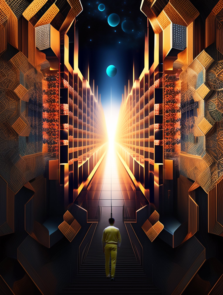 Explicação detalhada da figura 1 gerada pela IA Lexica.art. A dupla simulação ocorre em tempo real de vida da pessoa, então ela começa na origem (concepção e formação do embrião no útero) e segue até ao final da dupla simulação (biológica e cerebral). A luz que está ao final é a aplicação constante do método científico no decorrer desse caminho. Os planetas e estrelas que aparecem no topo, são o ambiente do universo ao qual o planeta terra e a pessoa estão inseridos. A vida da pessoa acaba quando a dupla simulação cessa (tanto para a consciência quanto para a pessoa representada, não há o depois), isso está de acordo com a segunda lei da termodinâmica (entropia).