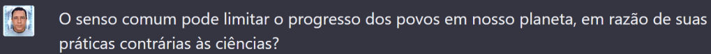 Resposta IA GPT: Sim, o senso comum pode limitar o progresso dos povos no planeta, especialmente quando as práticas contrárias às ciências impedem a adoção de tecnologias e práticas mais avançadas e eficientes.