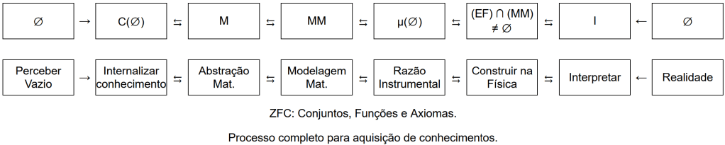 Axioma μ(∅) da Razão Instrumental: o segundo axioma destaca a importância de construir modelos (abstrações matemáticas), e aplicá-los na física para criar uma representação compreensível da realidade. A dupla seta “Abstração matemática” sugere a etapa em que construímos abstrações para representar a realidade de forma mais precisa, esse processo de abstração é bidirecional, pois nossos modelos podem influenciar como percebemos a realidade.