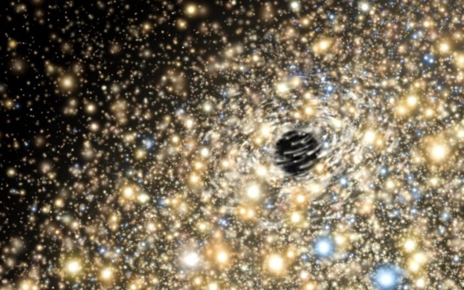 Ilustração mostra estrelas em movimento em uma galáxia elíptica, que tem em seu centro um buraco negro supermassivo. Fonte: Nasa