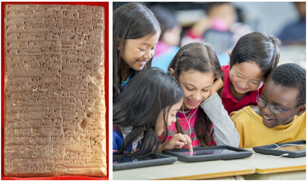 Podemos ver na foto acima que ambos os tabletes (o Sumério de 6000 anos atrás e os tabletes atuais), ocupam lugares no espaço; entretanto, os tabletes atuais possuem subespaços compactados em seu interior contendo bilhões de componentes nanométricos (chips de silício).